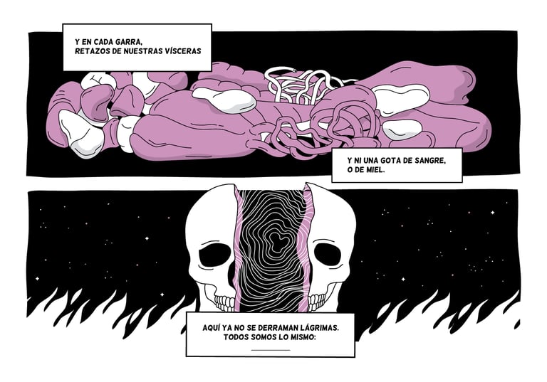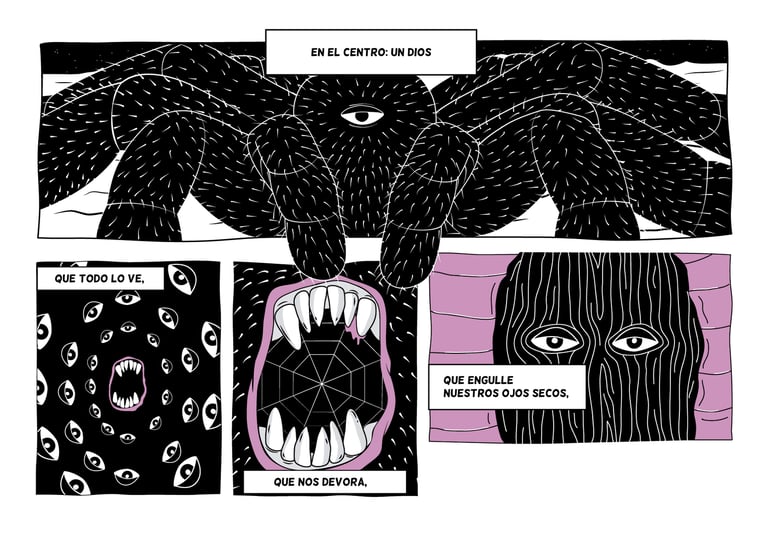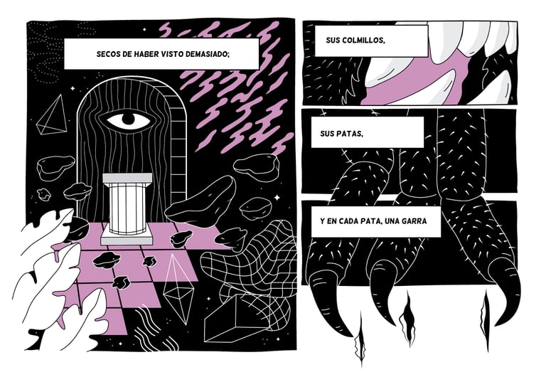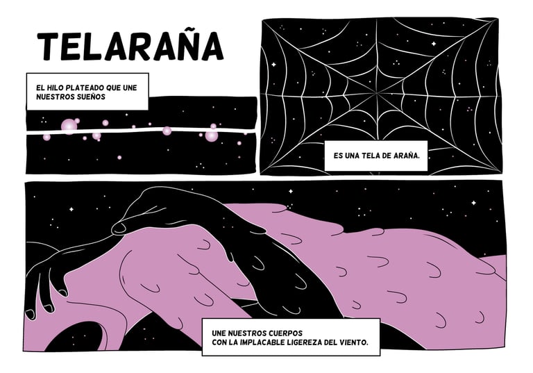 En mi caso, me correspondió trabajar con el poema “Telaraña”, del escritor Martín Torres. A partir de su texto, desarrollé una narrativa visual que buscó expandir las imágenes y sensaciones de la obra. El resultado fue una interpretación gráfica cargada de atmósfera y simbolismo.